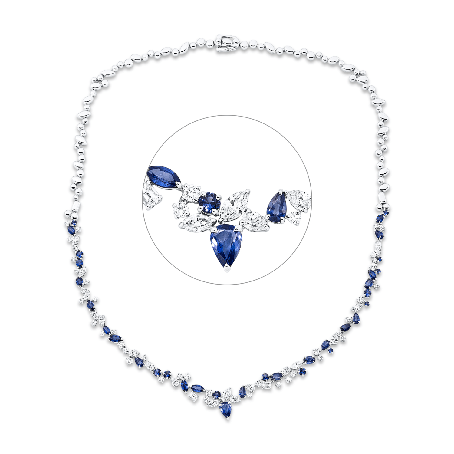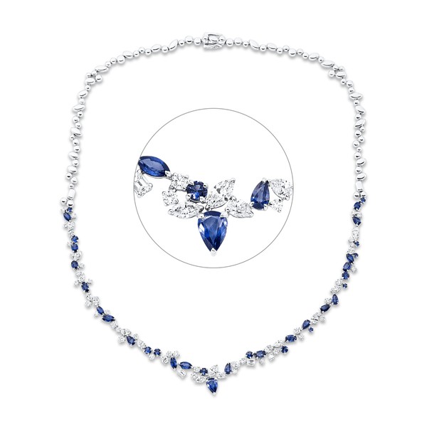 Collier aus 750 Weißgold 33 Saphire 6,53ct blau 58 Diamanten 4,4ct TW-SI L:45cm