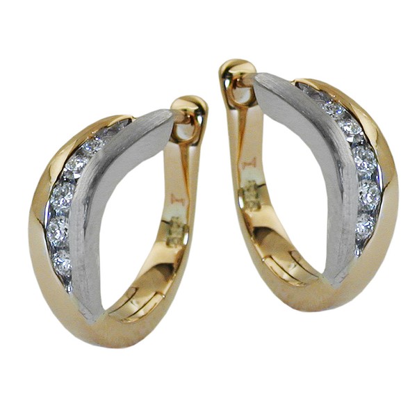 Wunderschön und exklusiv gearbeitete Creole mit Klappscharnier aus 585er Gold, 14 Karat, bicolor mit Weißgold. Diese edlen Stücke sind mit je fünf funkelnden Diamanten mit Brillantschliff besetzt und setzen ihre Trägerin in ein ganz besonders Licht. Der Innendurchmesser beträgt 10,1mm. Gesamtgewicht der Steine: 0,12Kt, Brillant-Qualität: GH SI
