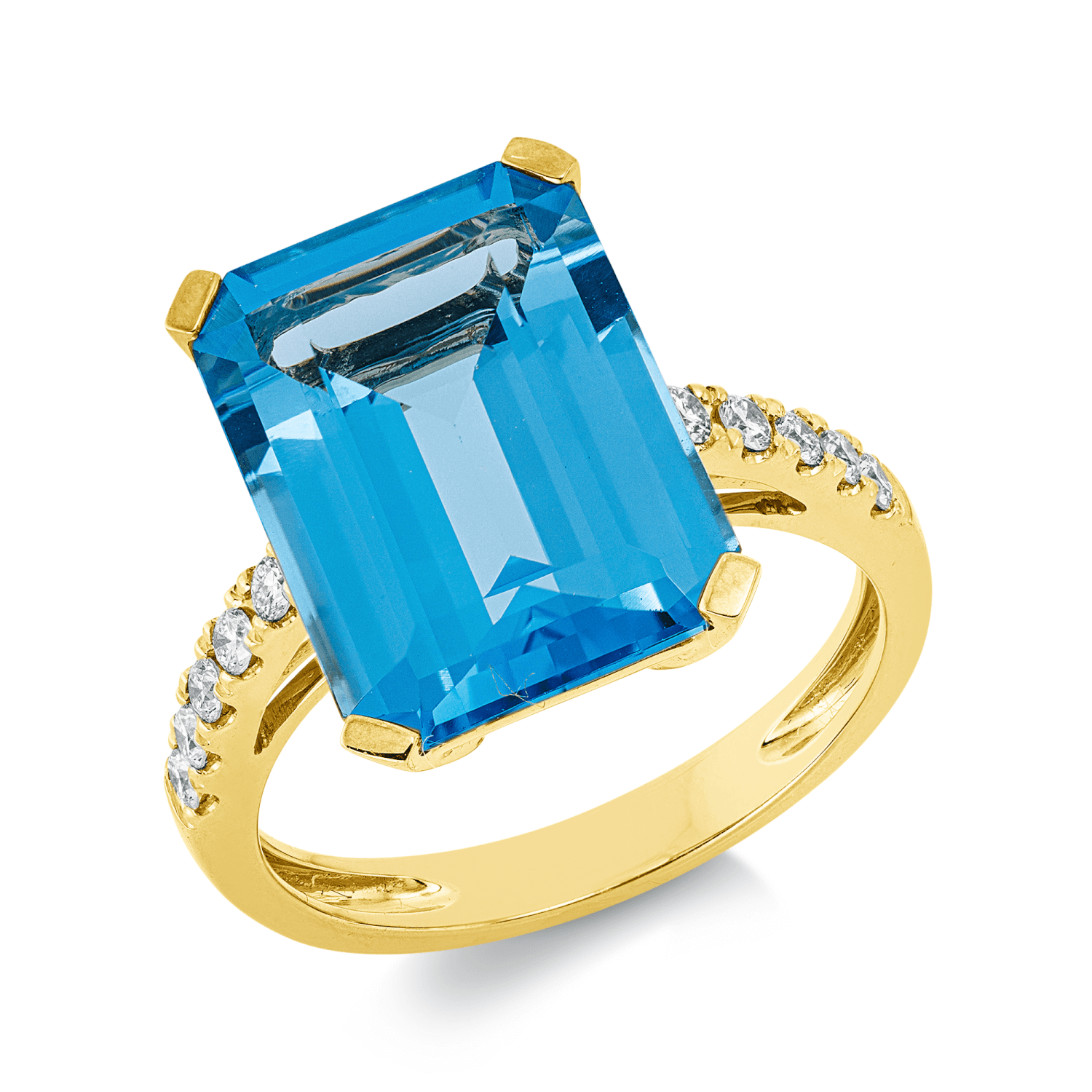 Ring aus 750 Gelbgold Topas 8ct blau 10 Brillanten 0,2ct TW-SI B:14,4mm 4er-Krappe