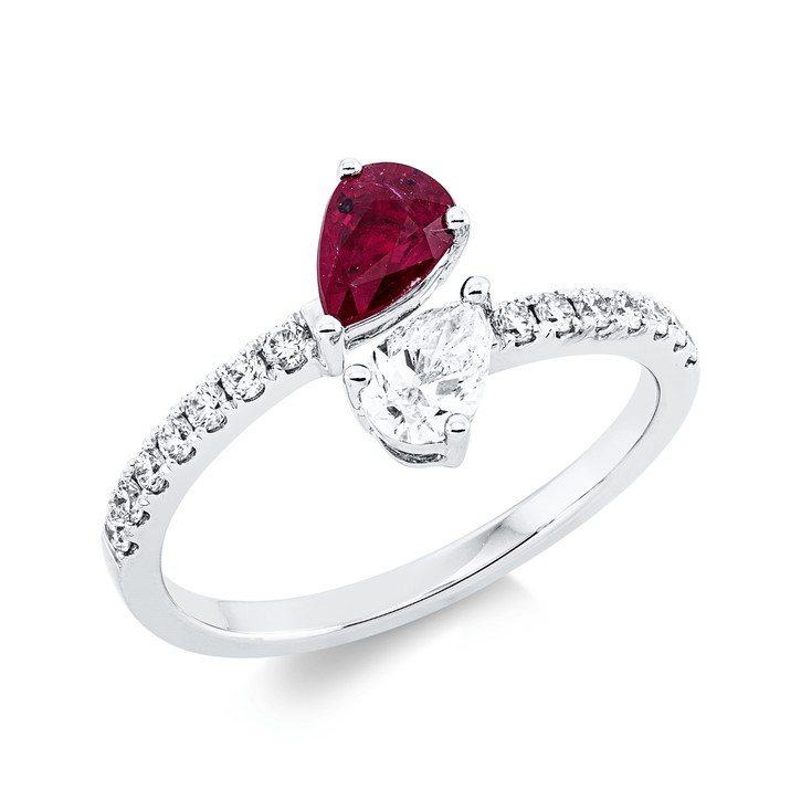 Ring aus 750 Weißgold Rubin 0,56ct rot 15 Diamanten Fanatsy-Schliff 0,53ct TW-SI
