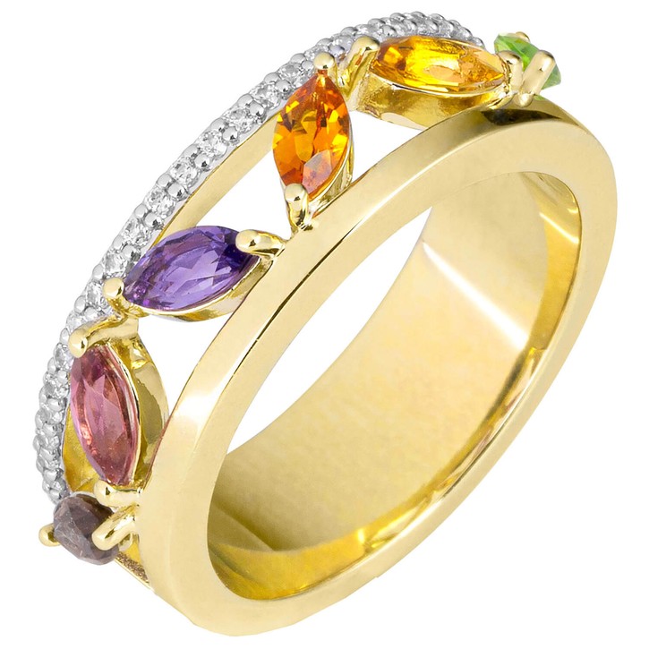 Damenring aus 14 Karat (585) Gelbgold, teilrhodiniert, mit einem Rauchquarz, einem rosa Turmalin, einem Amethyst, einem Citrin, einem Madeira-Citrin, einem Peridot und 26 Diamant-Brillanten, 0,169 ct., Feinbearbeitung gut