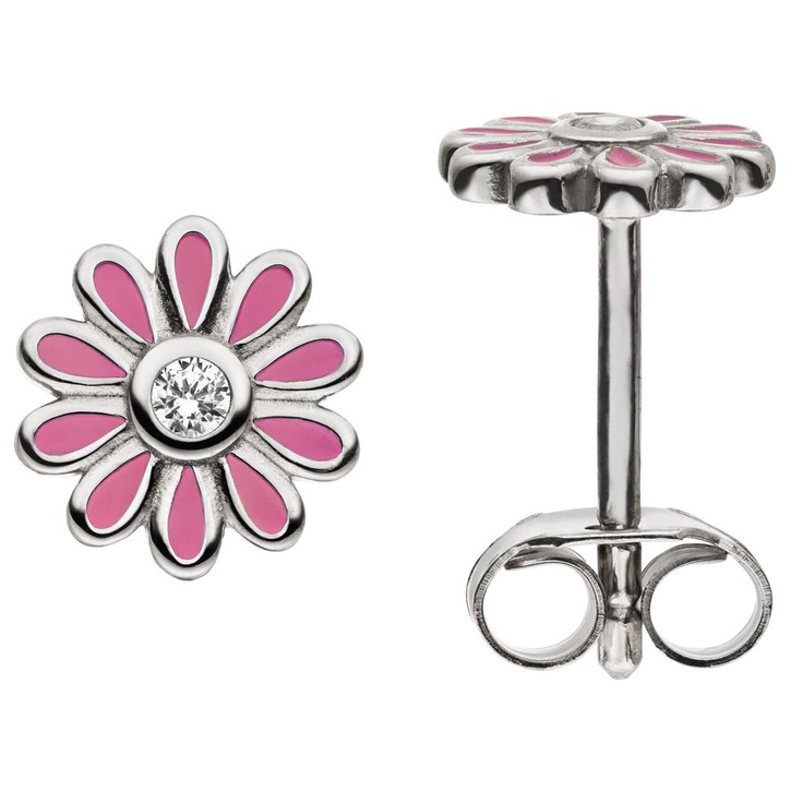 1 Paar Ohrstecker 'Blume' aus 925 Sterlingsilber, rhodiniert, Emaille-Einlagen rosa, mit 2 Zirkonia